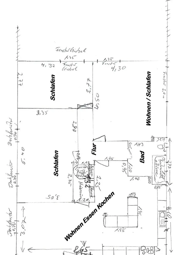 Es handelt sich um ein landwirtschaftliches Gebäude mit zwei getrennten Wohneinheiten, jeweils eine im Erdgeschoss und eine im Dachgeschoss.
